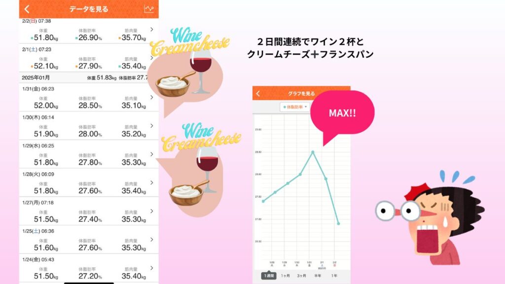 「少しだけなら大丈夫」と思っていたのが、体脂肪率の増加という形でしっかり現れたのです。