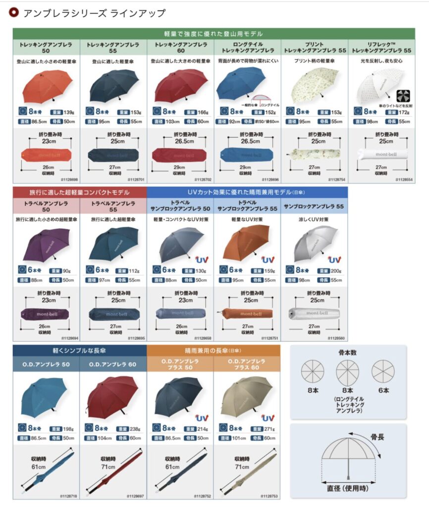 モンベルの傘シリーズにはサイズ違いや機能違いのモデルが豊富に揃っています。