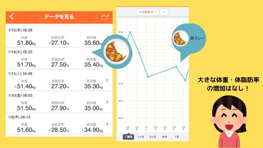 「こんなに食べたのに明日の体重は大変なことに…」と思いながら就寝。そして翌朝、恐る恐る体重計に乗ってみたところ、体重はほとんど増えていませんでした!